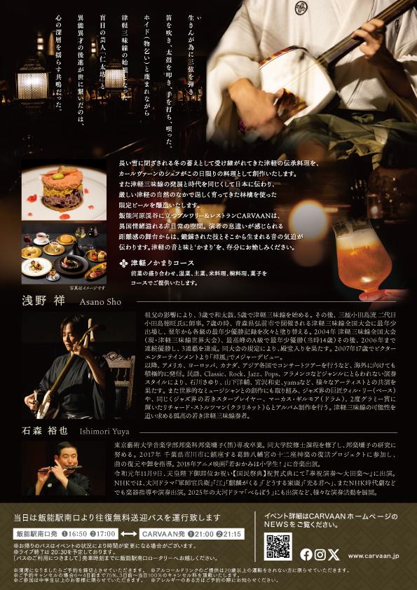 津軽ノかまり【日程】2025年11月15日(土) 17:00開場/18:00開演【会場】カールヴァーン 飯能本店【公演チケット】 お一人様 17,600円 (税抜 16,000円)[特別ディナーコース料理・生演奏ショーチャージ込み]【出演】浅野祥、石森裕也【お問合せ】CARVAAN TEL:042-973-7000